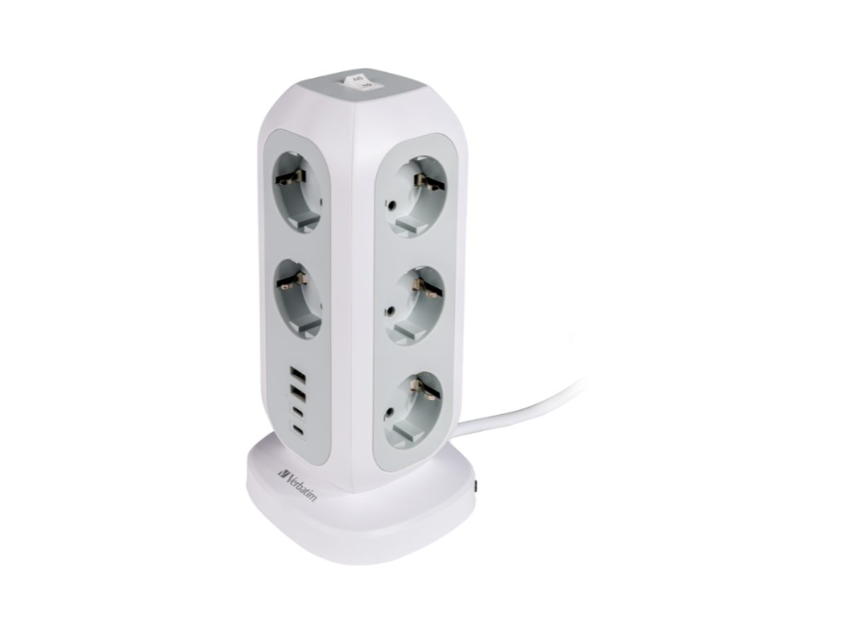 Verbatims EU-strømtårn har et pladsbesparende vertikalt design, der passer perfekt til dit hjem, køkken, kontor eller skole og holder dit skrivebord eller gulv rent og ryddeligt. En tænd-/sluk-knap øverst på tårnet giver dig mulighed for at slukke hele strømtårnet og spare energi, når enhederne ikke er i brug.