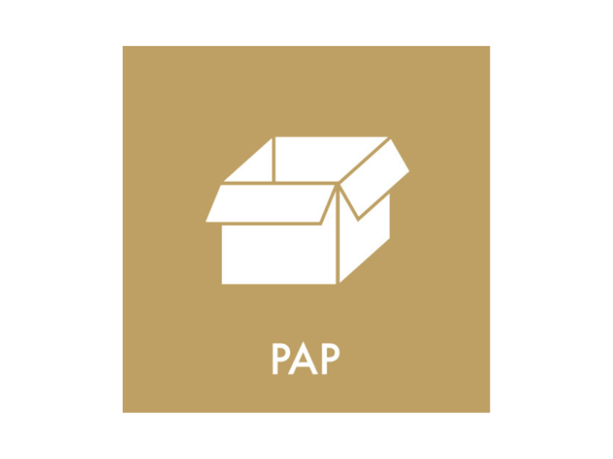 Affaldspiktogram til PAP i brun folie til tydelig angivelse af affaldstype ved sortering af affald. Piktogrammet er selvklæbende og kan let klæbes på en affaldsspand eller lign. Det er let at rengøre - tør blot af med en fugtig klud.