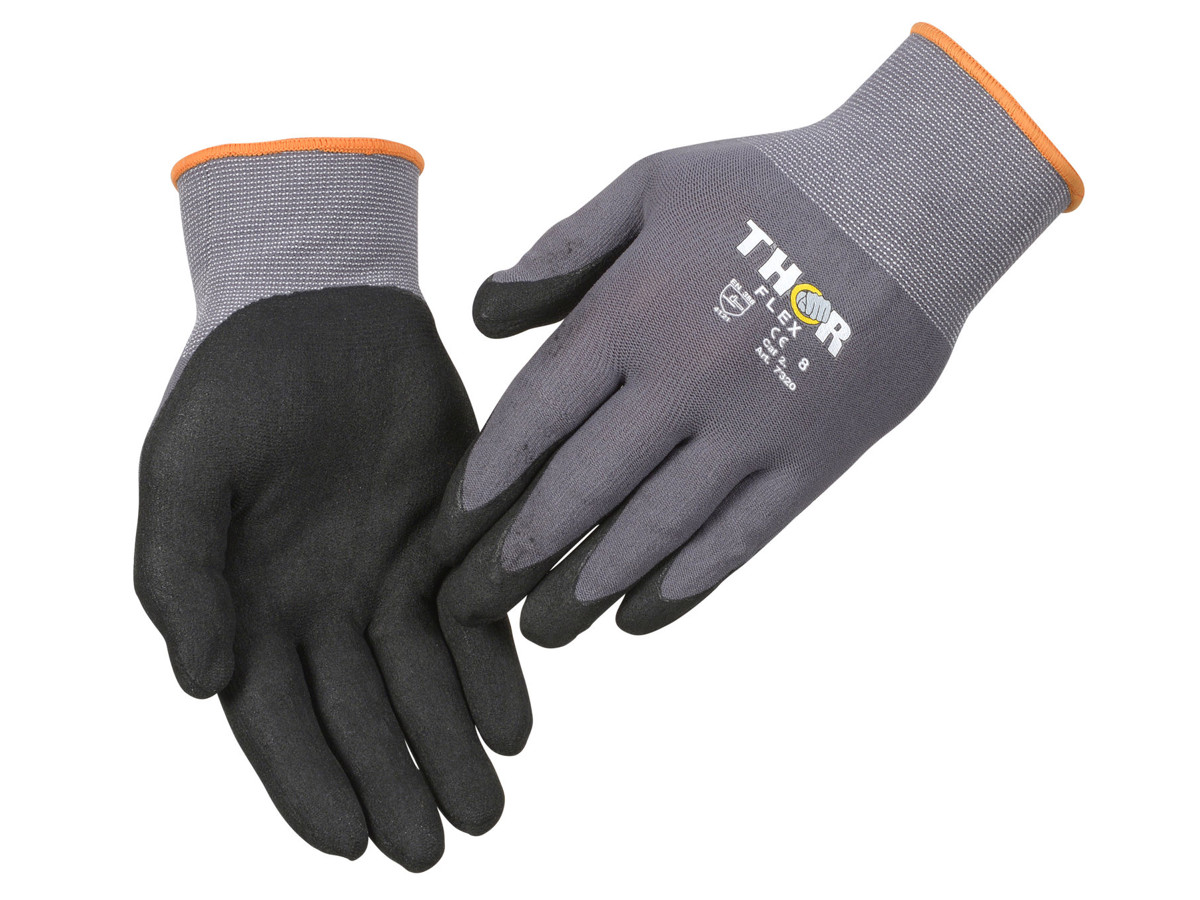 Med denne THOR Flex handske får du en slidstærk arbejdshandske forsynet med touch i tommel-, pege- og langefinger. Handsken er sømløs og strikket i nylon/spandex, ligesom den har en nylon/spandex ribkrave. Her får du en god allround-arbejdshandske, som blandt andet er velegnet til håndtering af fødevarer, ligesom den er god at bruge til industriarbejde, i byggebranchen, på autoværksteder samt til skovbrug, havearbejde og brolægning. Handsken tåler 3 gange vask ved temperaturer op til 60° grader kombineret med tørretumbling uden skrumpning i størrelse eller form.