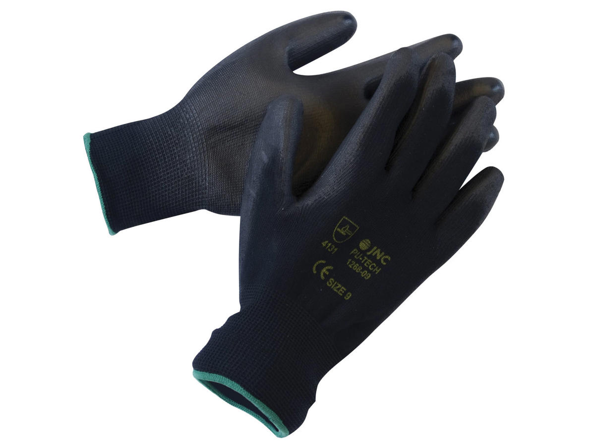 Letvægt arbejdshandske, Velegnet til microfiberrengøring. Gribefladen er coated med polyurethan således at microfiberne ikke slider eller trænger ind i huden. Håndryggen er ikke coated, for at sikre åndbare egenskaber for hænderne. Sort nylonhandske belagt med polyurethan. Velegnet til arbejde med våde og olierede emner