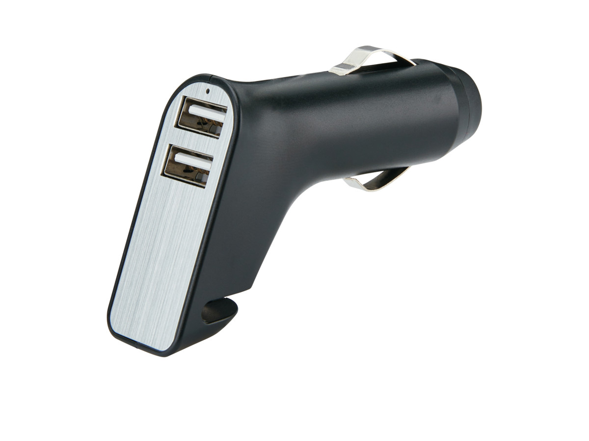 Oplader til bil med to porte, der kan bruges til at oplade to mobile enheder på samme tid. Med denne oplader følger også en seleskærer og en rudeknuser, så du altid har den inden for rækkevidde i tilfælde af en nødsituation. Udgang: 5 V/2,1A.