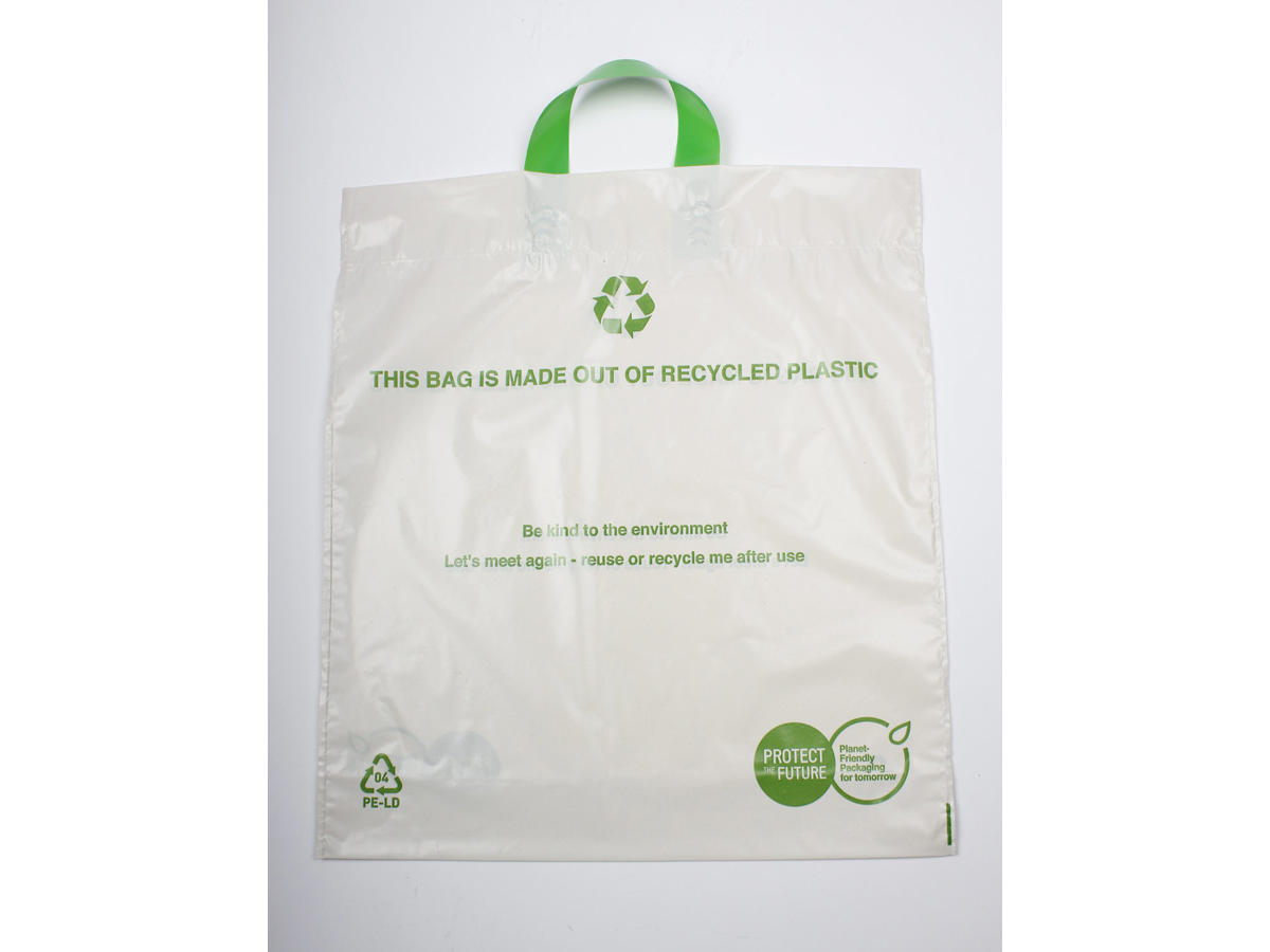 Bærepose med udvendigt håndtag, lavet i genbrugsplastik og påtrykt vejledende tekst.
