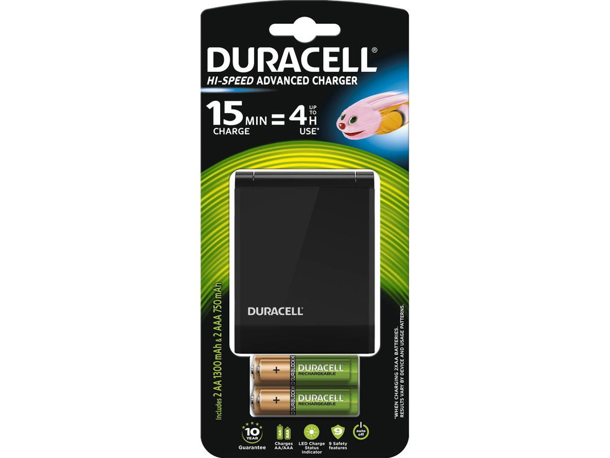 15 minutters opladning af AA/AAA batterier - 2 stk Duracell Active Charge (StayCharged) AA batterier - 2 stk Duracell Active Charge (StayCharged) AAA batterier - Individuelle ladekanaler. Kontrollerer defekte batterier. Indbygget sikkerhedstimer - Intelligent opladning - Switchmode adapter til hele verden.