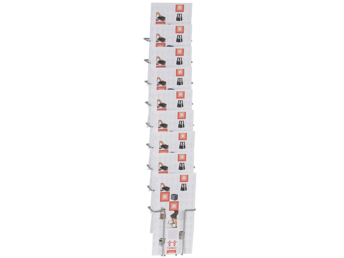 Brochureholderen er ideel til vægmontering og kan bruges til en bred vifte af tryksager, herunder brochurer, foldere og pjecer. Med en kapacitet på 9 fag til A5 størrelse og mål på 780 x 155 x 75 mm, sikrer den, at dit indhold præsenteres på en måde, der fanger opmærksomheden og vækker interesse.