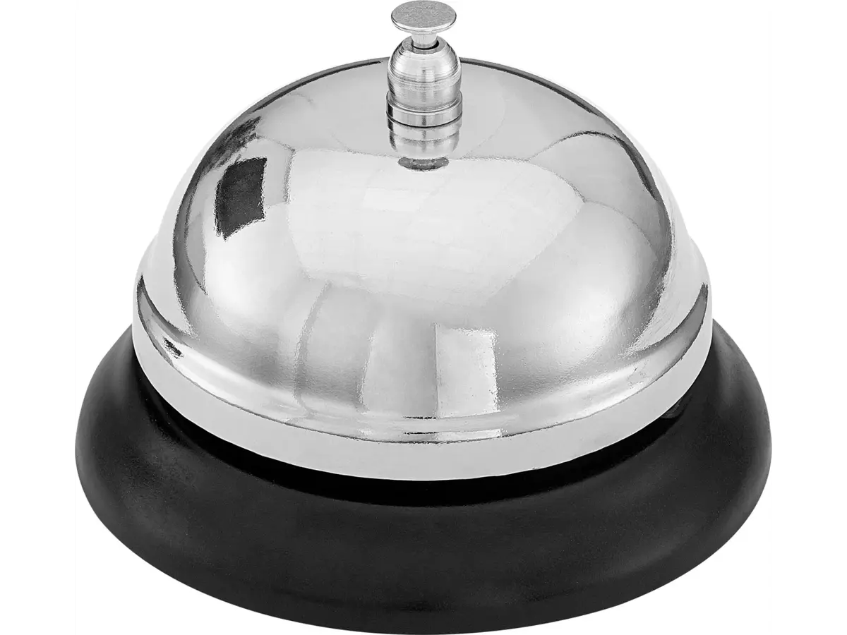 Klassisk receptionsklokke i krom, der er god at have stående på disken i receptionen på hoteller og restauranter, så du nemt kan tilkalde hjælp hvis skrænken skulle være tom.