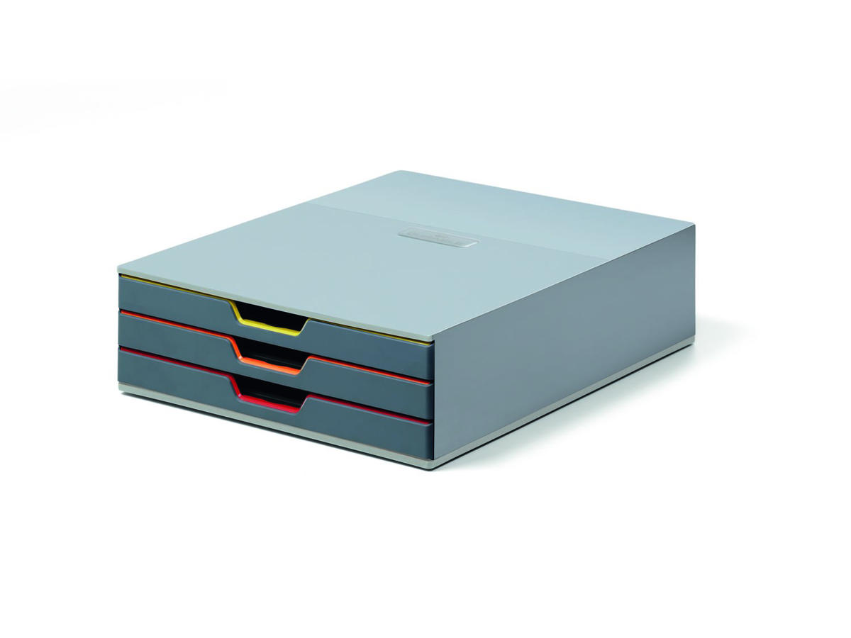 Attraktiv og innovativ skuffeboks med tre farvestrålende skuffer fremstillet af højeste kvalitet.Skufferne i forskellige farver gør det nemt at organisere sine dokumenter.Skufferne er forsynet med udtræksstop, og er nemme at åbne og lukke.Skuffeboksen leveres med transparente etiketter til opmærkning.Udskriftsvenlige etiketter som er nemme at udskifte.Stabelbar med skridsikre gummifødder på undersiden.Mål: 95 X 280 X 356 mm (HxBxD)