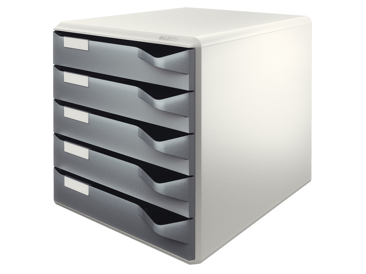 Skuffekabinet Leitz Post og Form set - 5 skuffer A4 er det perfekte valg for dig, der søger en robust og holdbar opbevaringsløsning. Det lysegrå hus med farvede skuffer tilføjer kulør til ethvert kontormiljø, og med Skuffekabinet Leitz kan du let organisere dine dokumenter, papirvarer og andre nødvendige kontortilbehør.