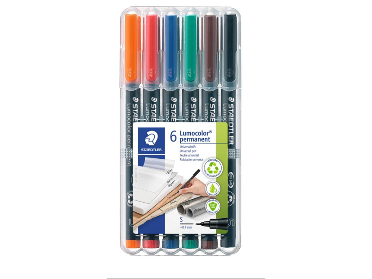 Lumocolor® permanent pen 313 til brug på stort set alle overflader. Velegnet til brug på cd'er / dvd'er samt mærkning på metal, plast, træ samt andre overflader. Smudsafvisende og vandfast kvalitet. Tørrer på sekunder, derfor ideel til venstrehåndede brugere. Permanent, lugtsvag blæk. Praktisk Stand-Up STAEDTLER box. PP skaft og hætte sikrer lang levetid. Kan ligge uden hætte i dagevis uden udtørring . Flysikker. Superb farve glans. Linjebredde superfine ca. 0.4 mm. Genopfyldelige. Etui med 6 assorterede farver