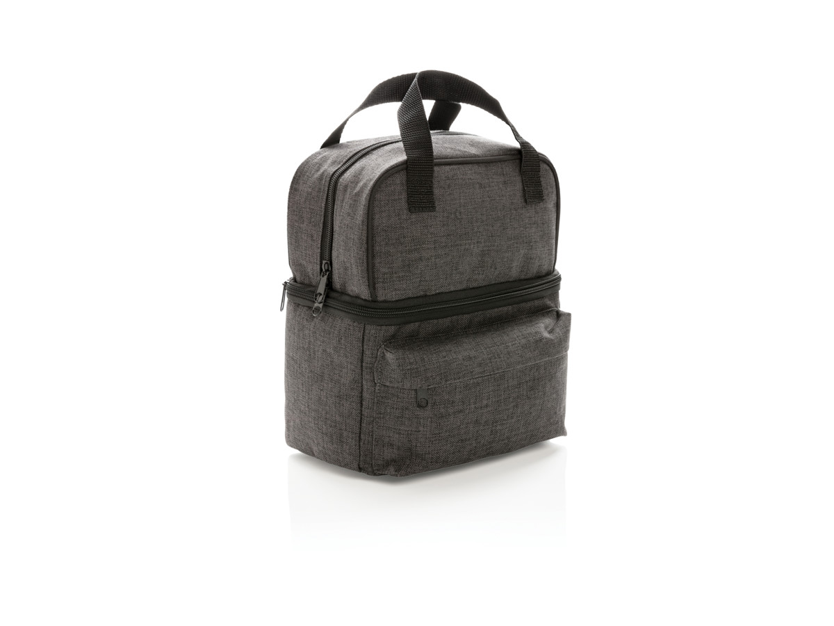 Køler i 600D polyester med håndtag og separate rum. Det rummelige øverste rum er velegnet til mad som frugt, snacks eller cookies. Det firkantede nederste rum er perfekt til at bære op til 6 dåser med drikkevarer. Lomme foran med lynlås, der er perfekt til små ting som nøgler.