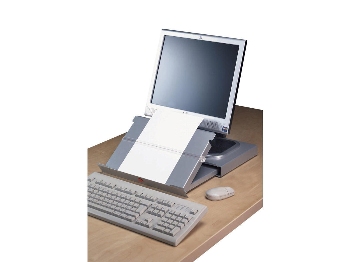 Konceptholderen i plade fungerer også som laptopstøtte. Konceptholder til dokumenter i A4-format med magnetlineal, som kan indstilles i 5 positioner. Placeres mellem skærm og tastatur. Kan stå direkte på bordet eller monteres på en liggende CPU.