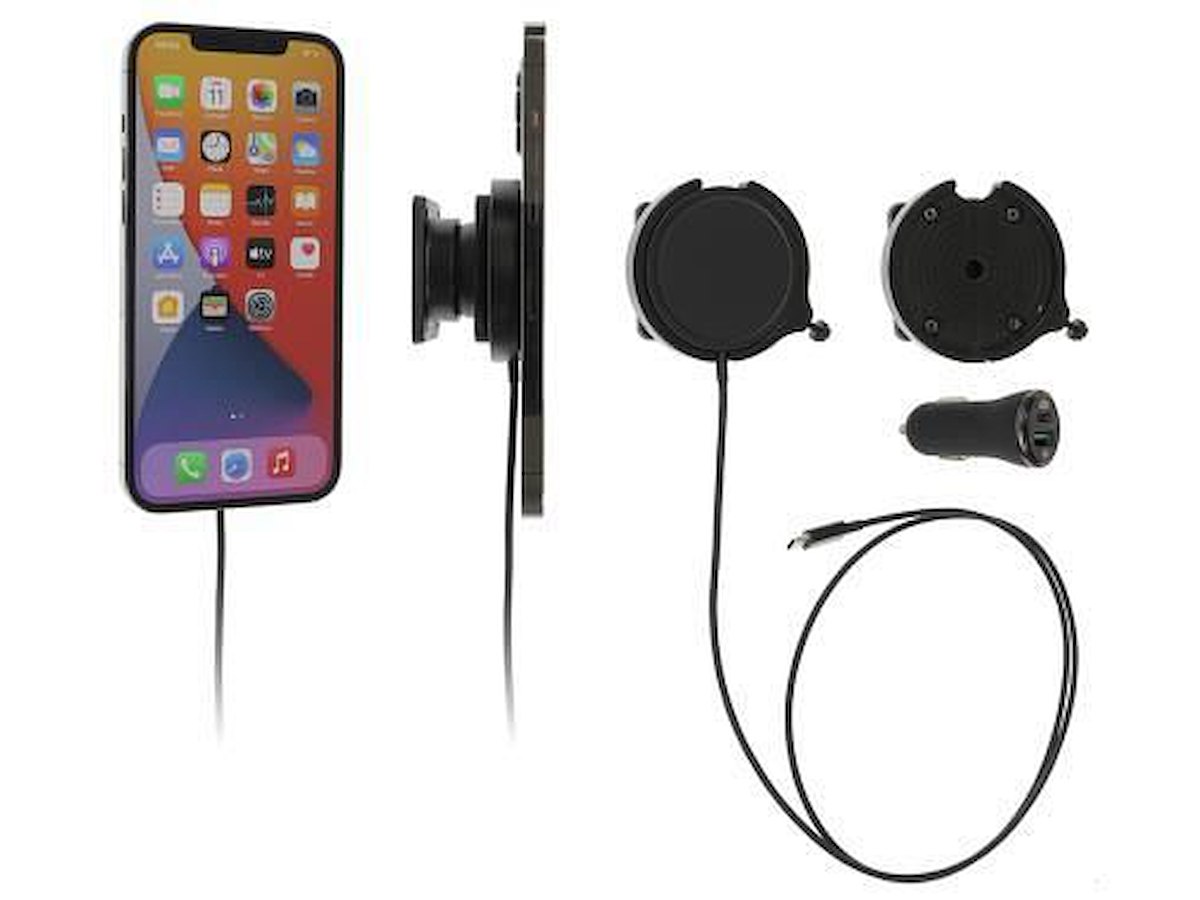 Hold dit iPhone-batteri fuldt opladet i en montering med magnetisk trådløs oplader, altid inden for nem synsvidde og rækkevidde! Pæn, diskret og praktisk. Specialfremstillet med en perfekt og fast pasform. iPhonen holdes sikkert på plads i oprejst position for maksimal mobilmodtagelse. Cig-stik-adapter med 2 USB-porte medfølger.