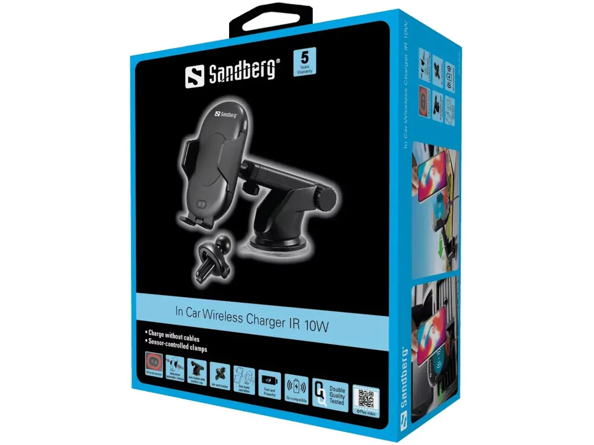 Sandberg In Car Wireless Charger IR er en kombineret holder og trådløs oplader til din smartphone med motordrevne klemmer. Holderen er udstyret med en infrarød sensor, der automatisk åbner de justerbare klemmer og lukker dem blidt omkring din smartphone. Den trådløse opladning starter med det samme. Klemmerne åbnes igen med et let tryk på den berøringsfølsomme knap på siden af holderen. Understøtter Qi-kompatible smartphones og hurtigopladning op til 10W.