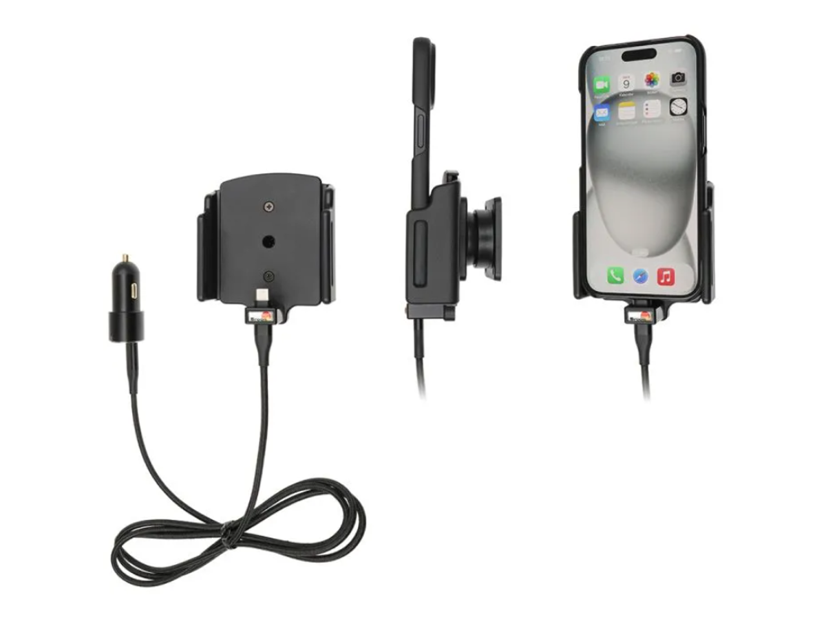 Dette er en aktiv holder, hvilket vil sige at holderen har indbygget laderstik og er med 12/24V cigarstik så du kan lade telefonen op mens den sidder i holderen. Denne model er lavet med en ren ledning med Type-C stik i begge ender Der medfølger cigaradapter med 2 indgange QC 3.0A + 2.4A, 1 x Type-C der bruges af holderen og 1 x USB-A der kan bruges af evt. andet udstyr. så den kan oplade din iPhone via cigartænderen. Hvis din bils radio understøtter det, så kan Type C stikket også tilsluttes til bilens radio, og derved få strøm og dataoverførsel den vej igennem (Funktioner afhænger af radioen).