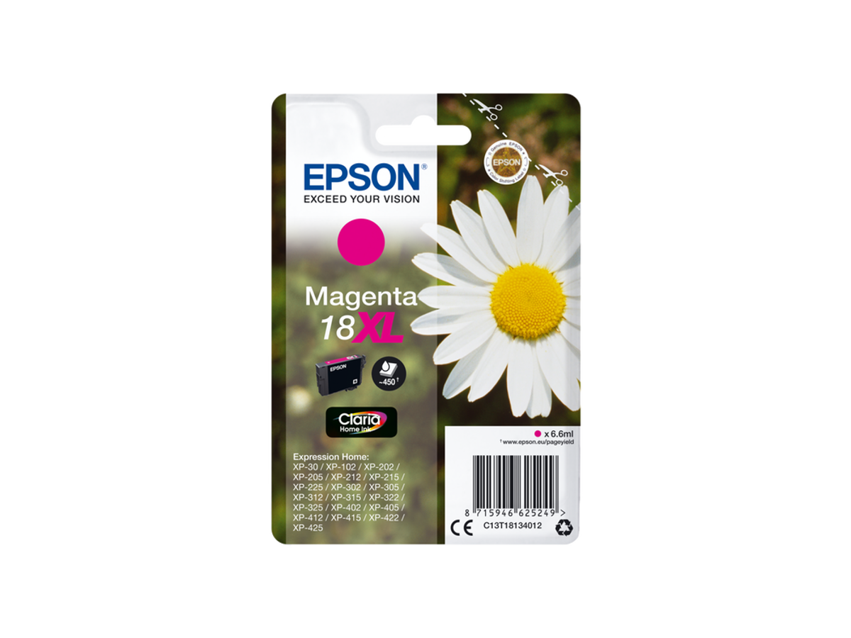 C13T18134012 passer til følgende printer: XP-30,XP-33,XP-100,XP-102,XP-200,XP-202,XP-205,XP-210,XP-212,XP-215,XP-225,XP-300,XP-302,XP-305,XP-310,XP-312,XP-313,XP-315,XP-320,XP-322,XP-325,XP-400,XP-402,XP-405WH,XP-410,XP-412,XP-413,XP-415,XP-420,XP-422,XP-425