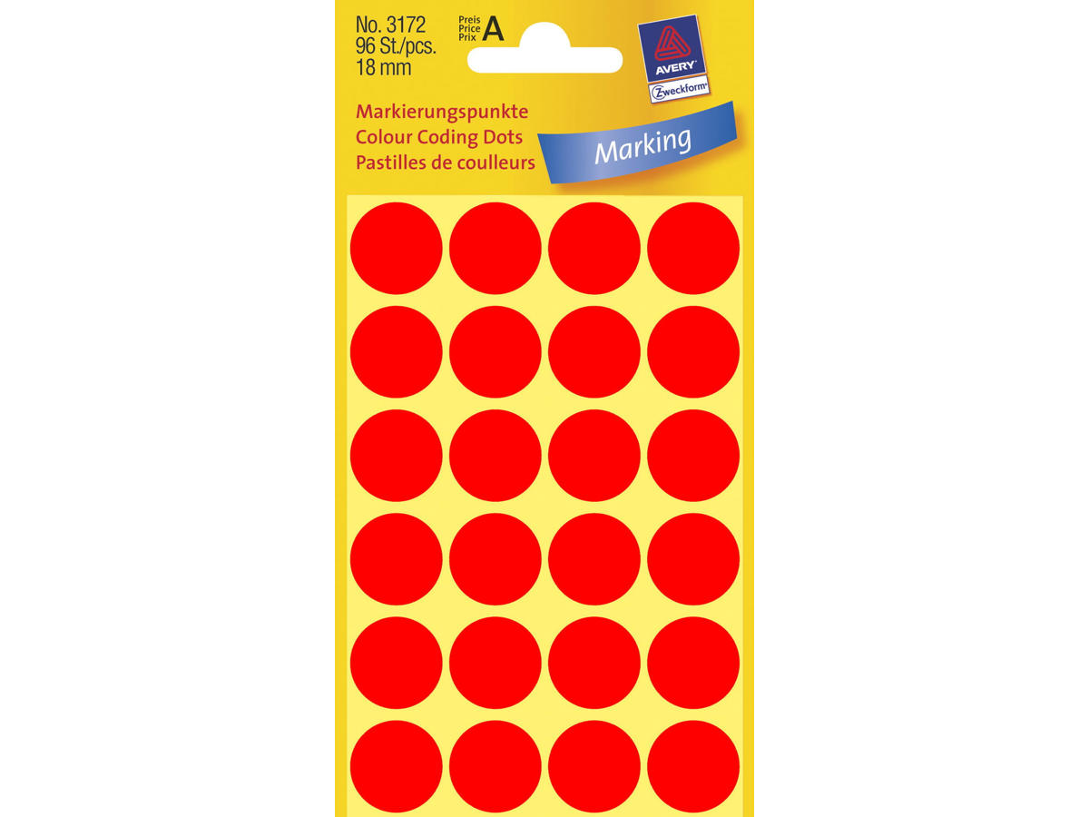 Med 96 permanent klæbende etiketter i hver pakke tilbyder Avery 3172 Prikmærkater dig en simpel metode til at holde styr på dine opgaver, planer og aftaler. Deres fejende røde farve gør det nemt at placere dem på et kort, en kalender eller en tidsplan for hurtigt at fremhæve vigtige datoer og steder.