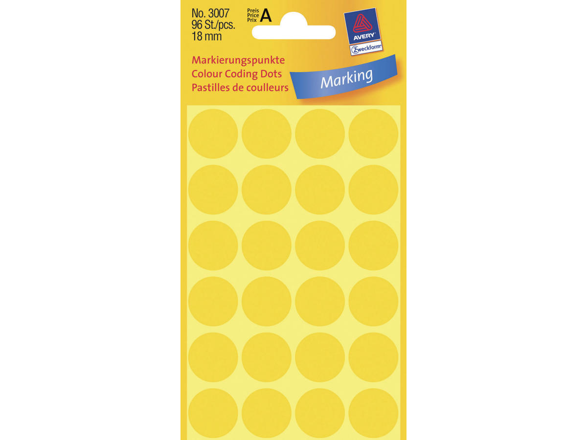 Sæt kulør på dit liv med Avery 3007 Prikmærkater. Disse farvekodningsdots, med deres klare gule farve og permanente klæbeevne, er et uovertruffent værktøj til planlægning og organisering.