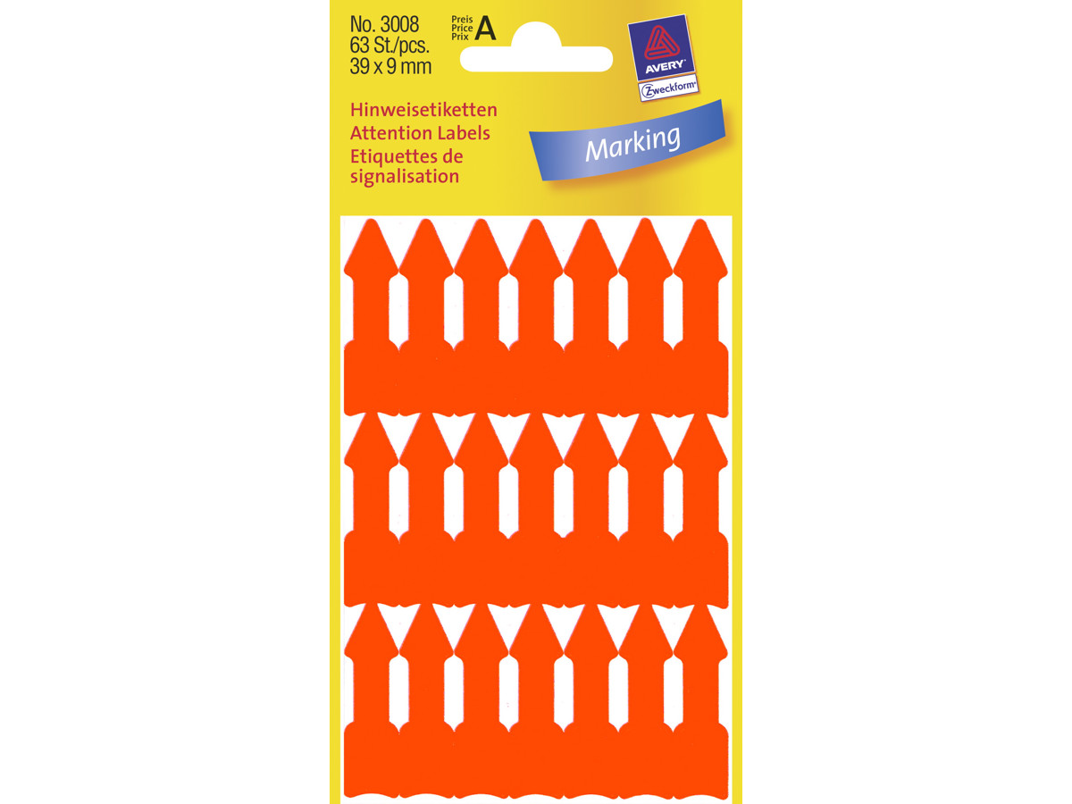 Avery 3008 er et sæt af etiketter i specialformer, der kommer i en klar orange farve, hvilket gør dem utroligt iøjnefaldende. Etiketterne præsenterer en ideel måde til tydeligt at markere og fremhæve vigtige informationer på.