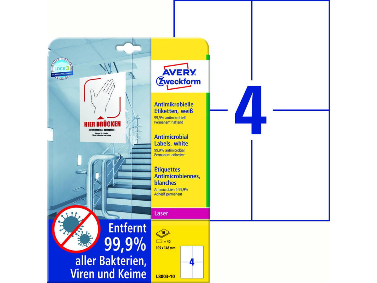 Antimikrobielle etiketter Avery L8003 er særdeles effektive. De innovative og effektive folieetiketter fjerner 99,9% af alle vira, bakterier og mikroorganismer - det perfekte og sikre supplement til enhver rengøringsrutine. Anbring penge enkelt de antimikrobielle selvklæbende folier på ofte berørte overflader som f.eks. døre, lyskontakter, håndtag og mange andre.