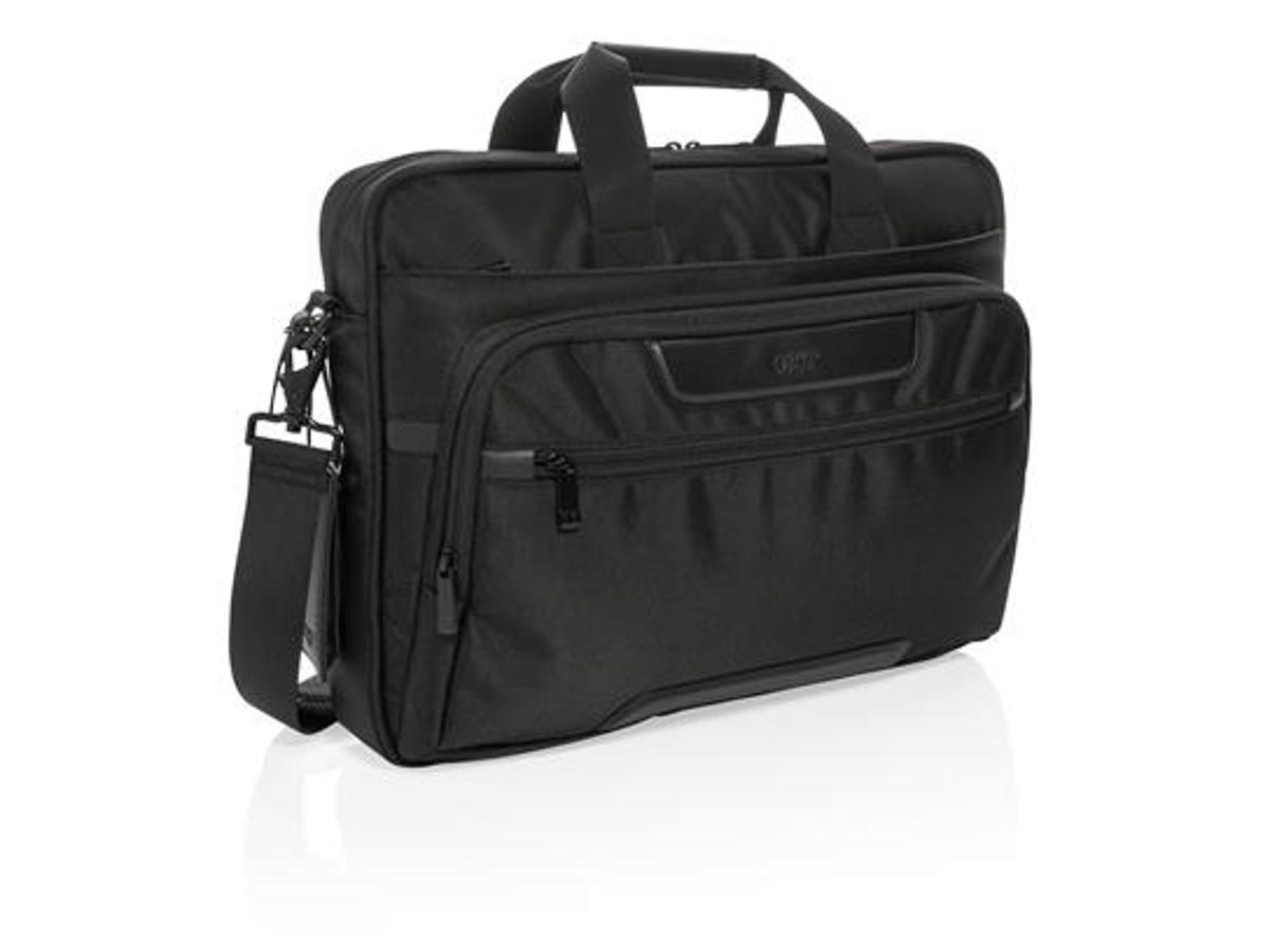 Gør din daglige rejse en smule nemmere og smart med denne laptop taske. Tasken er lavet i holdbar 1.680D RPET polyester med PU detaljer. Har flere lommer til opbevaring og organisation. Ud over det rummelige hovedrum har denne laptop taske plads til en 15.6" laptop samt en lynlås lukket lomme til dine ejendele. Der er USB udgang, RFID lommer, penne holder samt aftagelig kuffertmærke.