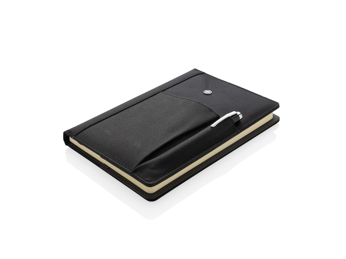 Eksklusiv 1.680D og 600D polyester notesbog omslag med pen. Inklusive aftagelig notesblok med 192 siders 80gr/m2 papir. Lommen på omslaget har plads til penne, kreditkkort, kontanter, mobiltelefon etc. Pakket i flot Swiss Peak gaveæske