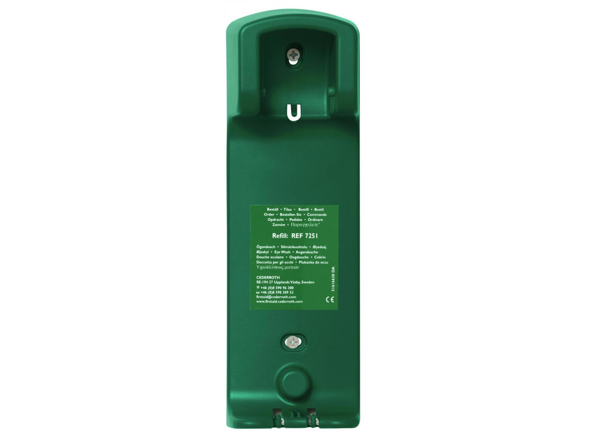 Flasken sidder fastlåst i vægholderen og åbnes automatisk, når den vrides ud af holderen – man kan straks begynde at skylle øjet.