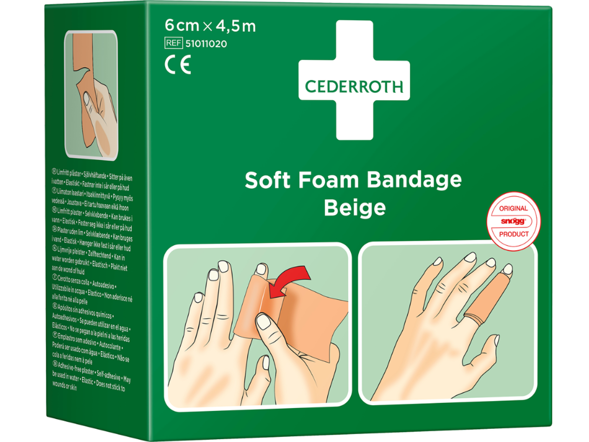 Cederroth Soft Foam Bandage er selvklæbende, uden lim, og den klæber derfor ikke fast på hud eller i hår.