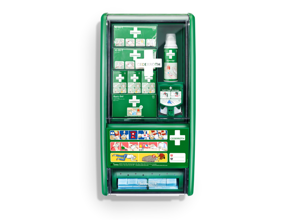 Førstehjælpsstationen med ekstraudstyr til forbrændinger. Cederroth First Aid & Burn Station Det her er en Førstehjælpsstationen til alle, som arbejder inden for fag med stor risiko for forbrændinger, eksempelvis kokke, elektrikere og svejsere.