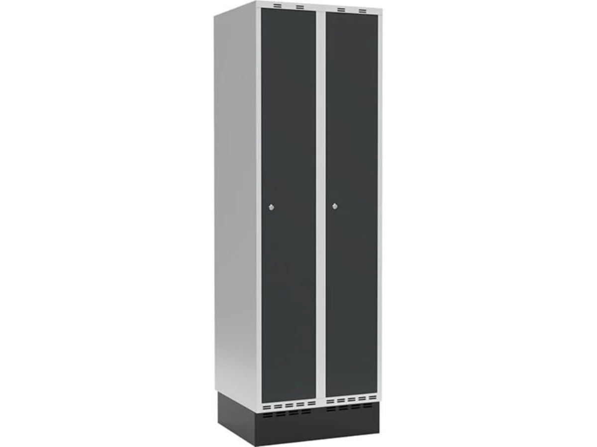 Dette garderobeskab i stål (2 x 300 mm) er med lige tag, 1 rum i højden og med cylinderlås færdig monteret i dørene.