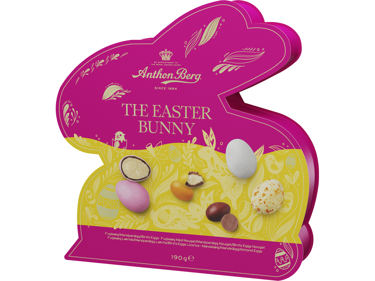 Den uforglemmelige smag af Påske. I denne fine gaveæske formet som en påskehare finder du et udvalg af Anthon Bergs velkendte påskeklassikere: mandelæg, chokoladeæg og fugleæg i varianterne marcipan, nougat og lakrids. Den perfekte kombination af de gode smage fra Anthon Berg og påskens smukke farver, og gaveæsken er den ideelle gave til påskefrokosten.
