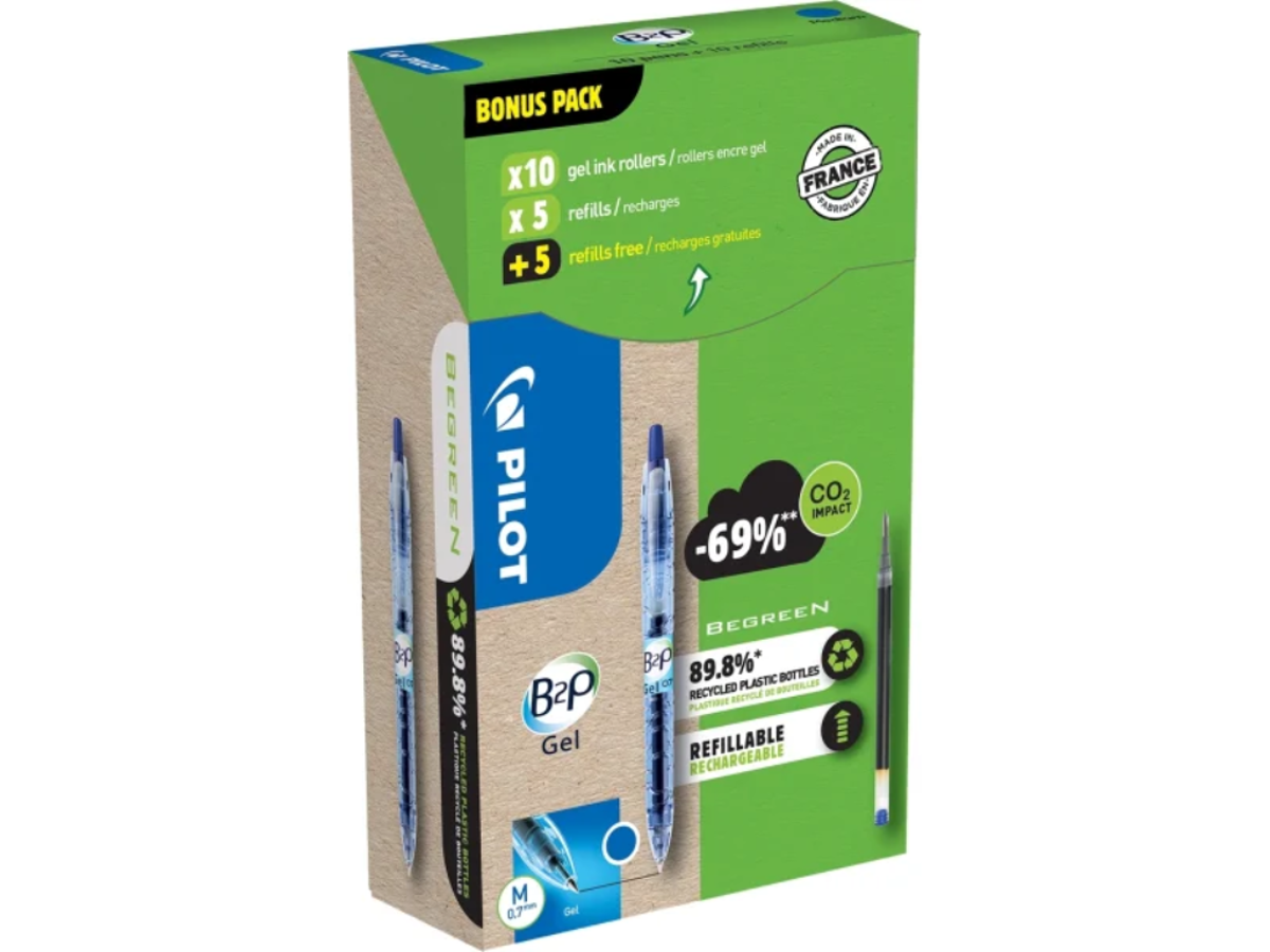 Skab klare, præcise linjer med denne Gelpen Blå fra Pilot B2P Gel serien. Dens mellemstore spids glider jævnt over papiret, hvilket gør det nemt at skrive eller tegne detaljerede illustrationer. Pilot B2P Gel Greenpack leveres med 10 blå gelpenne og 10 refiller, så du aldrig løber tør for blæk.
