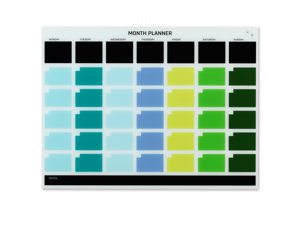 Månedstavlen er designet til at give et komplet overblik over din måned. Den kan skrives på med kridtmarkere eller almindelige whiteboard markere, og er også magnetisk. For at opslå noter eller meddelelser på tavlen, skal du bruge Neodymium magneter, som er ekstra stærke magneter.
