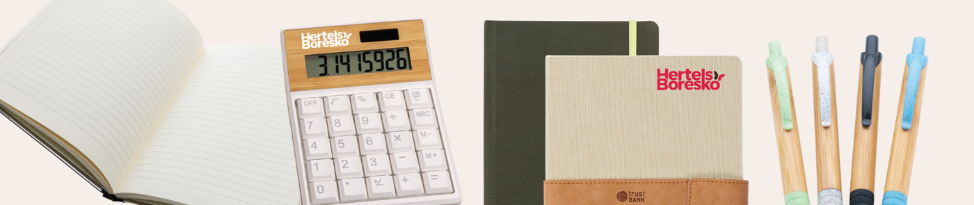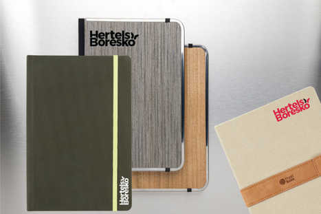 Hertels Boresko tilbyder et varieret udvalg af notesbøger med logotryk, herunder executive notesbøger, standard notesbøger og portfolier.