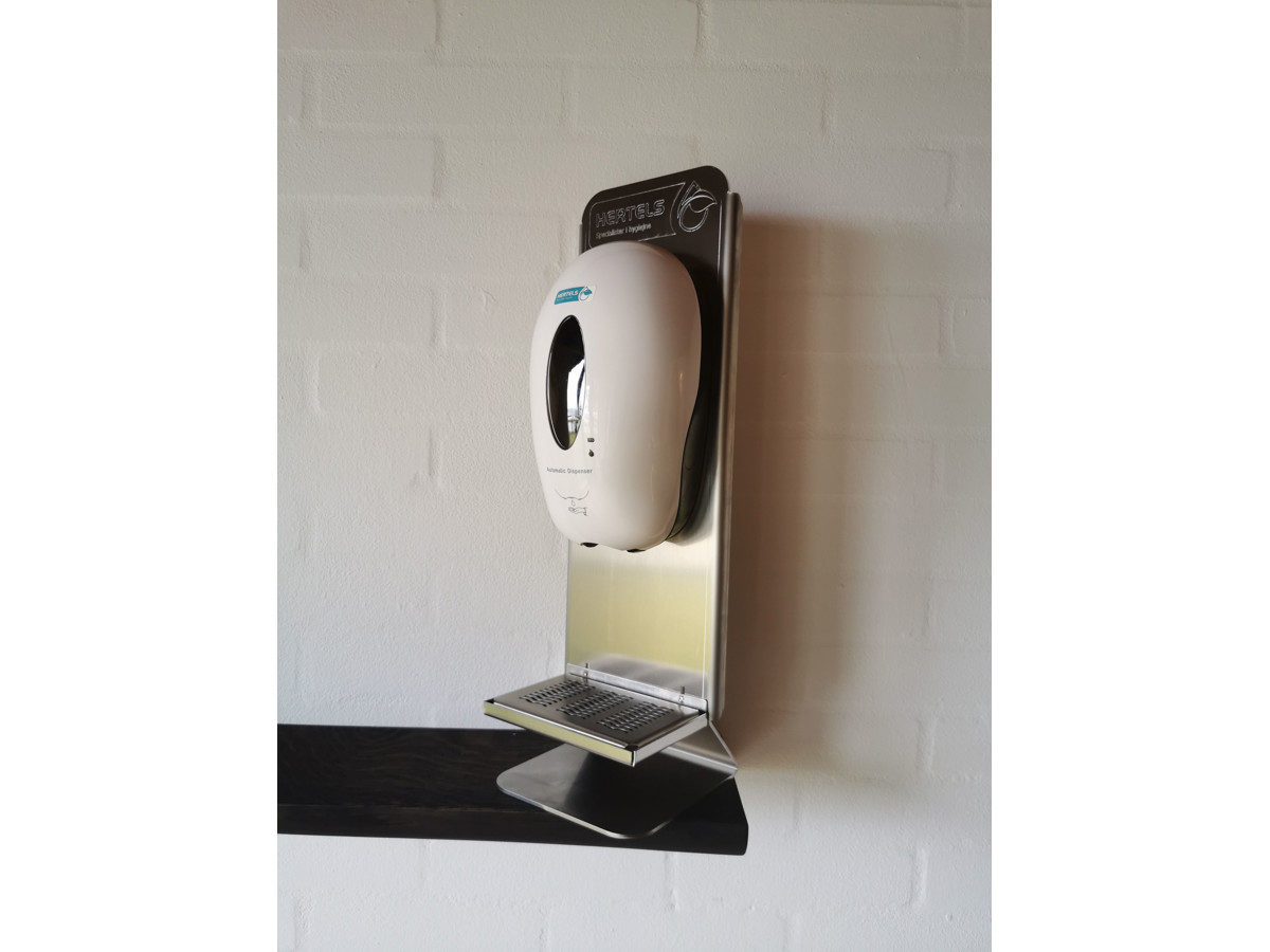 Bordstander i rustfrit stål, hvor dispenseren kan klistres på og er aftagelig. Samtidig er der drypbakke, så man kan tage af og rengøre.