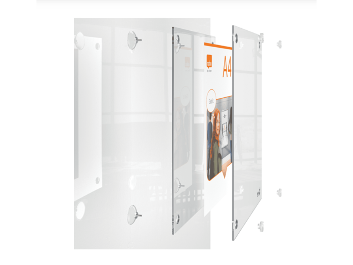 Denne plakatramme i akryl, der kan monteres og omplaceres, har et moderne, rammeløst design, der giver et stilfuldt og moderne udtryk. Med sin sugekopmontering kan plakatrammen fastgøres på enhver ikke-porøs overflade i høj- eller tværformat og giver hurtig og enkel udveksling af indhold. Den gennemsigtige overflade kan nemt tørres af, hvilket gør denne skilteholder til en ideel løsning til visning af midlertidige eller permanente skilte, dokumenter eller information. Visningsområde i størrelse A4.