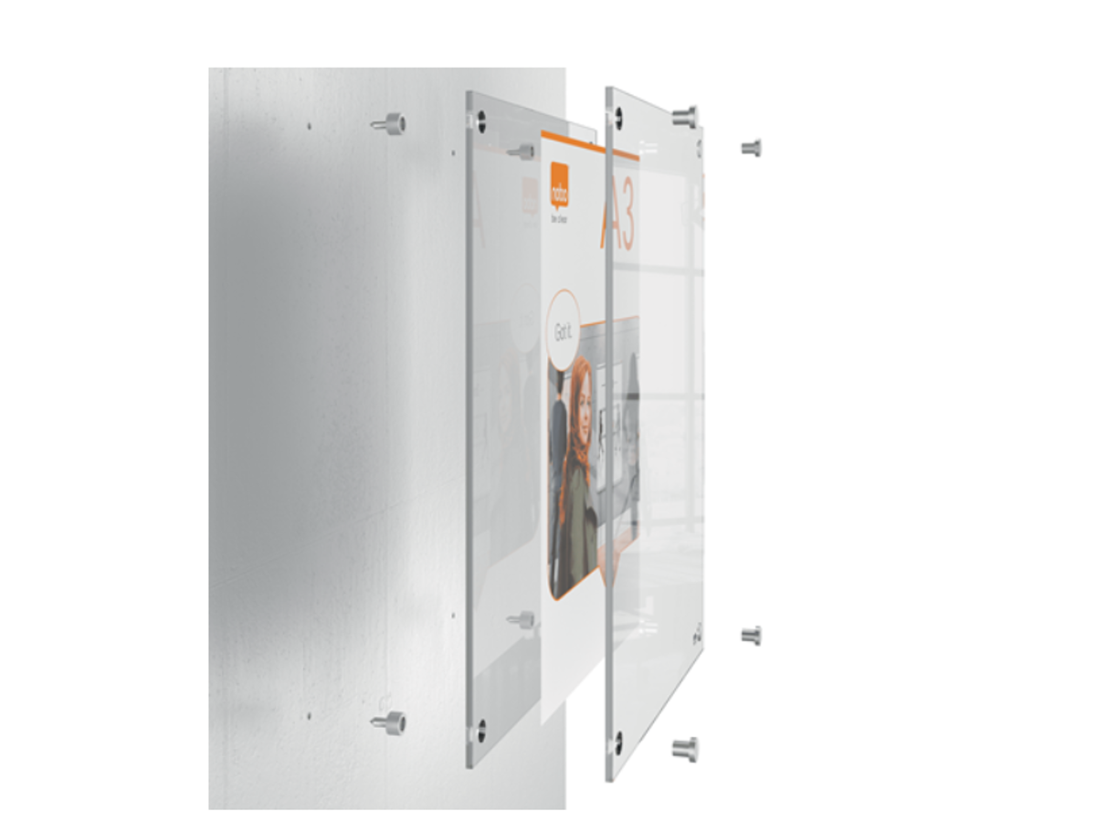 Denne vægmonterede akrylplakatramme med moderne, rammeløst design har et stilfuldt og moderne udtryk. Den sømløse akrylplakatramme med hjørnemontering giver mulighed for hurtig og enkel udveksling af indhold i høj- eller tværformat, samtidig med at dine dokumenter beskyttes. Akryloverfladen kan nemt tørres af, hvilket gør denne skilteholder til en ideel løsning til visning af midlertidige eller permanente skilte, dokumenter eller information. Visningsområde i størrelse A4.