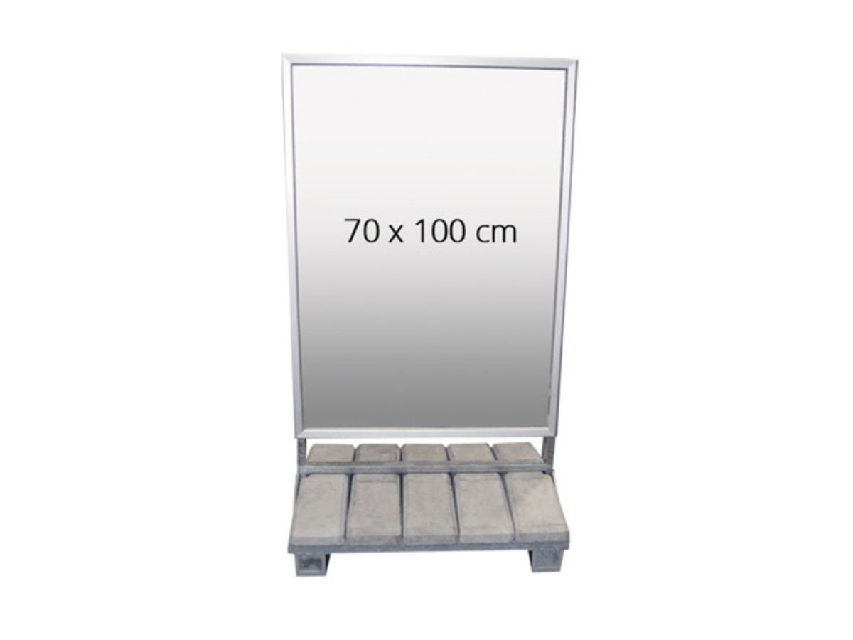 100% stormsikkert skilt i kraftig udførelse i galvaniseret stål og fod med betonmoduler, som kan fjernes én for én, ved afmontering af hele topsektionen, som også sikrer, at betonmodulerne ikke kan bruges til hærværk. Foden er udstyret med 4 ben, der gør at skiltet let kan flyttes rundt ved hjælp af en palle- løfter eller lign. Securityramme med 42 mm alu- profiler på begge sider - plakaterne er dermed sikret, men skiftes let og hurtigt ved hjælp af nøgleværktøjet, som medfølger. Logoplade kan købes som tilbehør og monteres hurtigt og enkelt.