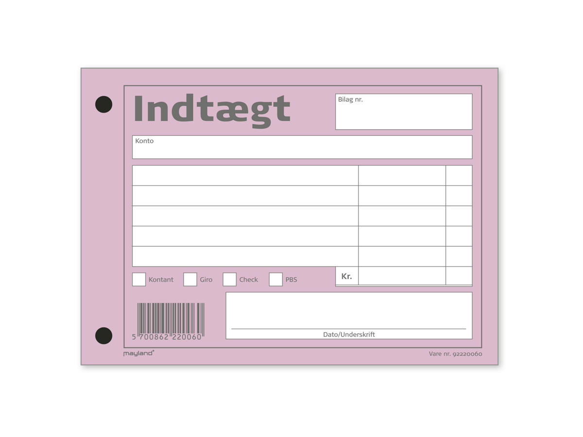 Hold styr på virksomhedens økonomi med vores indtægtsbilag i en praktisk limet blok med 100 afrivningsblade. Hvert bilag er designet med tydelige felter til udfyldning af konto, dato, beløb og nummerering, hvilket gør det nemt at registrere og organisere indtægter. Dette produkt er ideelt for virksomheder, der ønsker at have en fysisk oversigt over deres økonomiske posteringer.