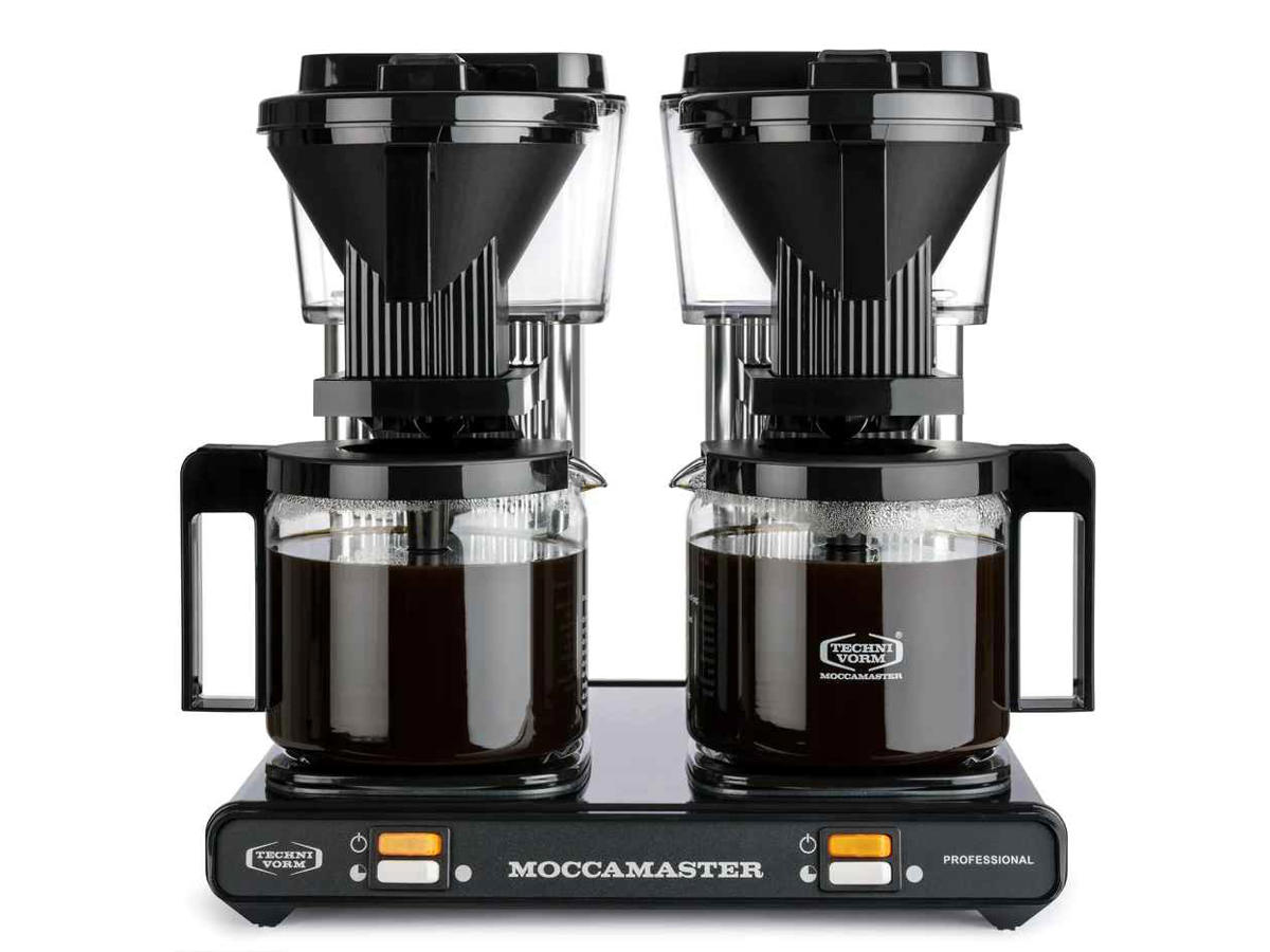MoccaMaster Professional Double Black/Silver. Den klassiske MoccaMaster som dobbelt model. Kabinettet udført i ridsefast aluminium. Brygger 2 x 10 kopper på ca. 6 min. (2 x 1,25 ltr - 20 kopper) - automatisk drypstop.