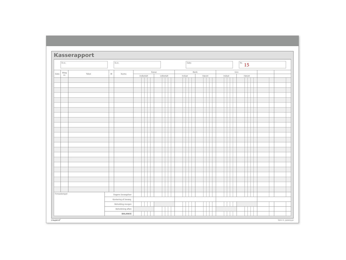 Optimer din økonomiske administration med vores nummererede kasserapportblok. Denne praktiske blok indeholder kolonner til kasse, bank, giro og en ekstra kolonne, hvilket gør det nemt at holde styr på dine posteringer. Med dedikerede linjer til datofelt, firmastempel og afstemning, får du et professionelt værktøj til at organisere dine finansielle optegnelser.