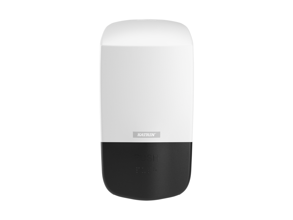 • Sæbedispenser fra Katrin, som kan bruges til alle sæbetyper: flydende sæbe, skumsæbe, alcogel, toiletdesinficering og kropssæbe.