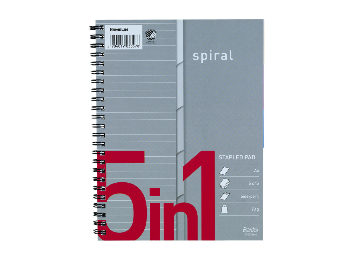 Smart index spiral blok med farvet index faner til forskellige emner. Blokken indeholder linjeret papir.