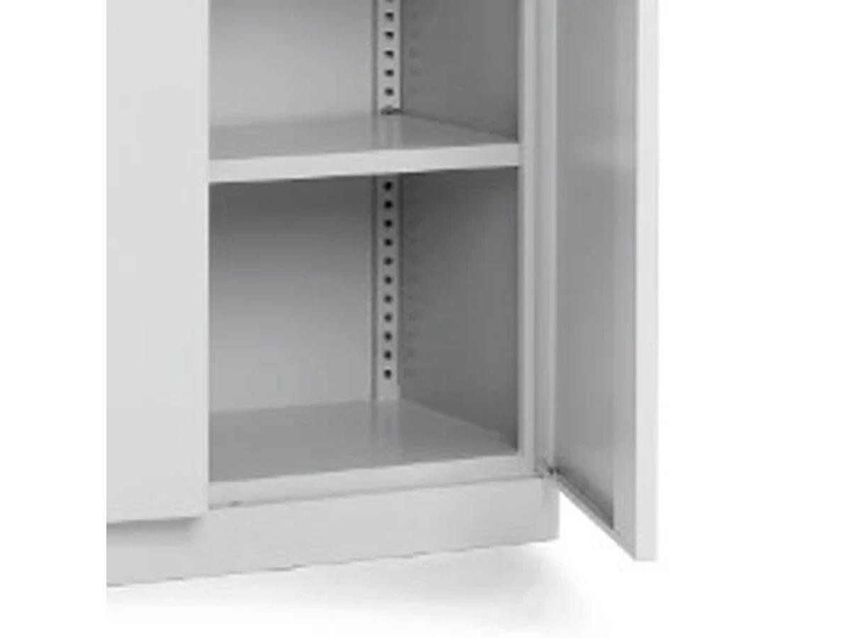 Hylde komplet med 4 hyldekroge. Passer til vore SMK skabe B= 1000 mm. Lakeret i RAL 7035, lysegrå. Belastning: 75 kg. pr. hylde jævnt fordelt.
