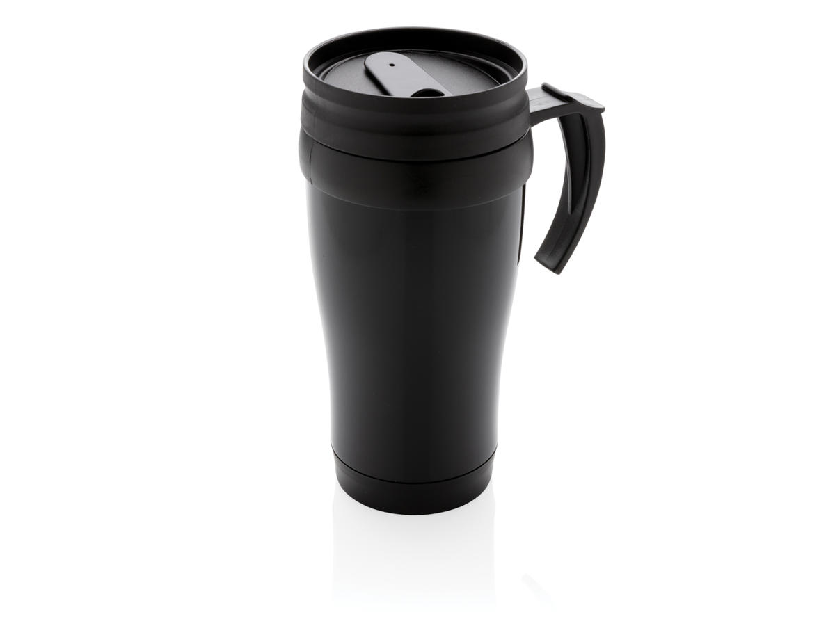 350ml krus i rustfrit stål på ydersiden og PP på indersiden med låg og bund i sort.
