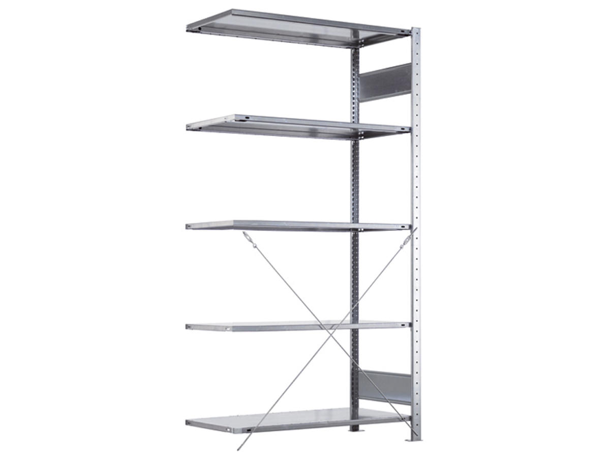 Galvaniseret stålreol. Leveres med 5 hylder og rygkryds. Belastning 150 kg pr. hylde, jævnt fordelt.