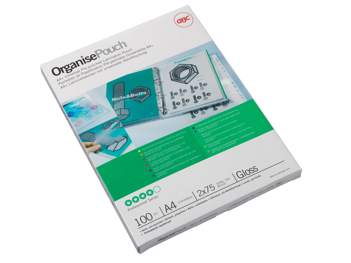 GBC Organise lamineringslomme forhullet tilbyder optimal beskyttelse af dine dokumenter - uanset om de er udstansede eller udstansede - ideel til arkivering eller arkivering i ringbind med 2 eller 4 ringmekanismer i A4-format.
