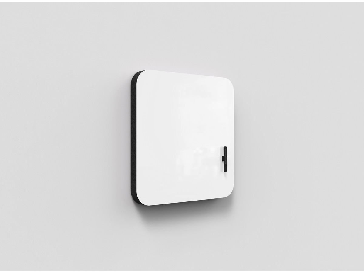 Denne variant af Lintex Bloc er en glastavle med stof hele vejen rundt om den 50 mm bredde ramme. Tavlen har med de 45mm lydabsorberende fyld, samtidig den funktion, at den reducere støjen i rummet.