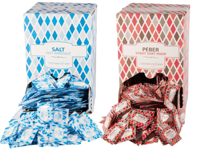 Med salt og peber i portionsbreve gør du det nemt for dine kunder at krydre maden til deres smag. Det er samtidig hygiejnisk og let for jer at stille dem frem. I skal blot åbne displayet op og lad kunderne tag den mængde, de skal bruge. Det er måske også derfor, at salt og peber i portionsbreve er meget populære indenfor restaurantbranchen. De er også gode at have stående på caféer. Vi forhandler salt og peber fra mærket NN. Ved at have salt og peber i portionsbreve så kan man nemmere styre, hvor meget salt og peber man kommer i sin mad, og man behøver derfor ikke bekymre sig om, at man har puttet for meget i maden.
