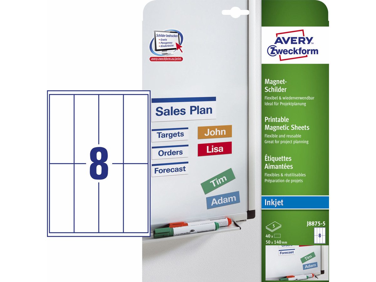 Kvaliteten og pålideligheden af Avery's magnetiske skilte giver dig ro i sindet, når du organiserer dit område. Hvis du bruger whiteboard til projektstyring eller har brug for aftagelige skilte til produktinformation, er Avery J8875-5 magnetiske skilte det perfekte valg for dig.