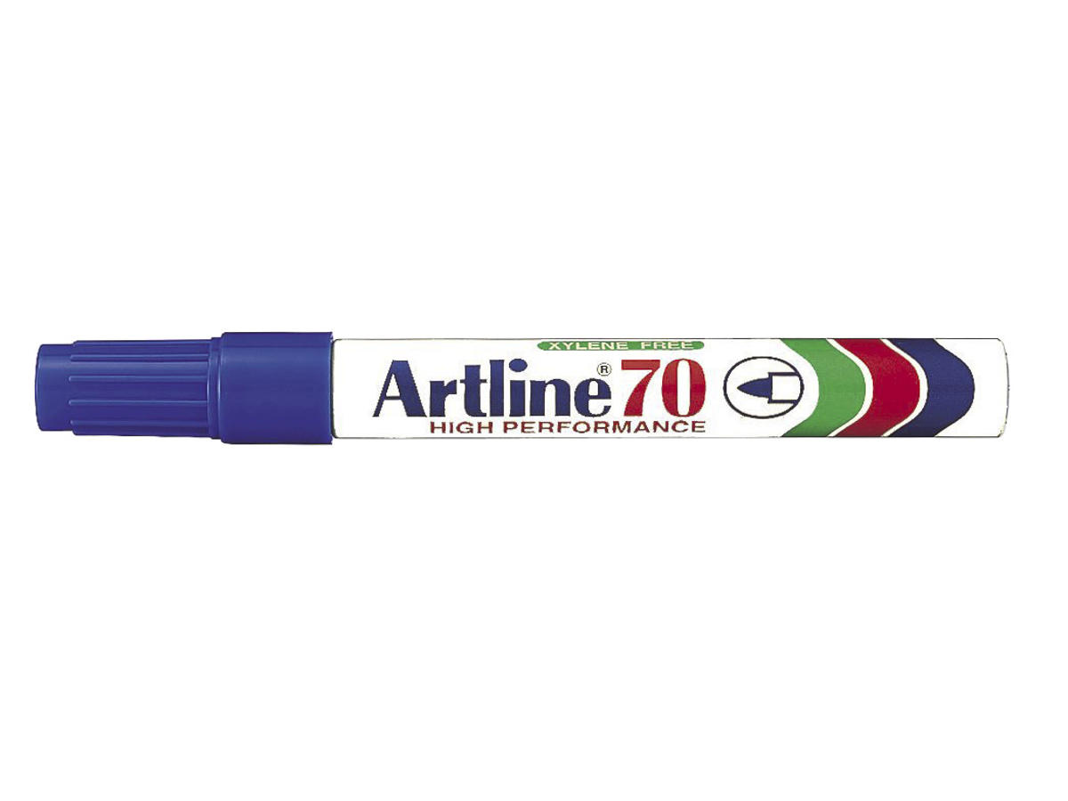 Marker Artline 70 er en blå permanent marker med en bemærkelsesværdig farvegengivelse. Dens hurtigttørrende blæk gør det et fremragende valg til brug i både kontor-, industri-, skolemiljøer og hjemmet. Markeren er let at håndtere takket være sin aluminiumskappe, hvilket øger dens holdbarhed over tid.