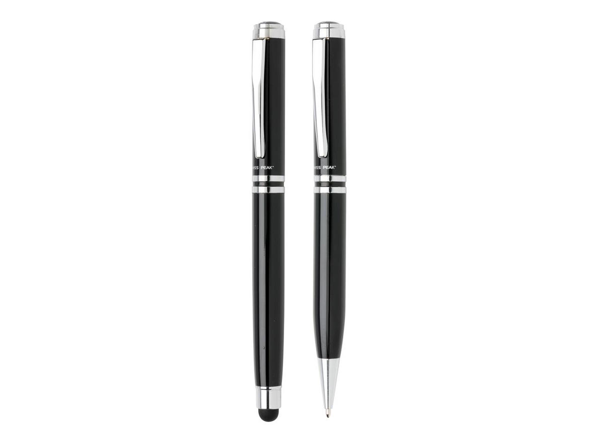 Adelig, autentisk og klassisk kvalitets penne sæt. Kraftig kvalitets messing rollerball med stylus, samt ballpoint begge med Swiss Peak logo. Inklusive lækker PU læder etui og gaveæske. Blå skrift.